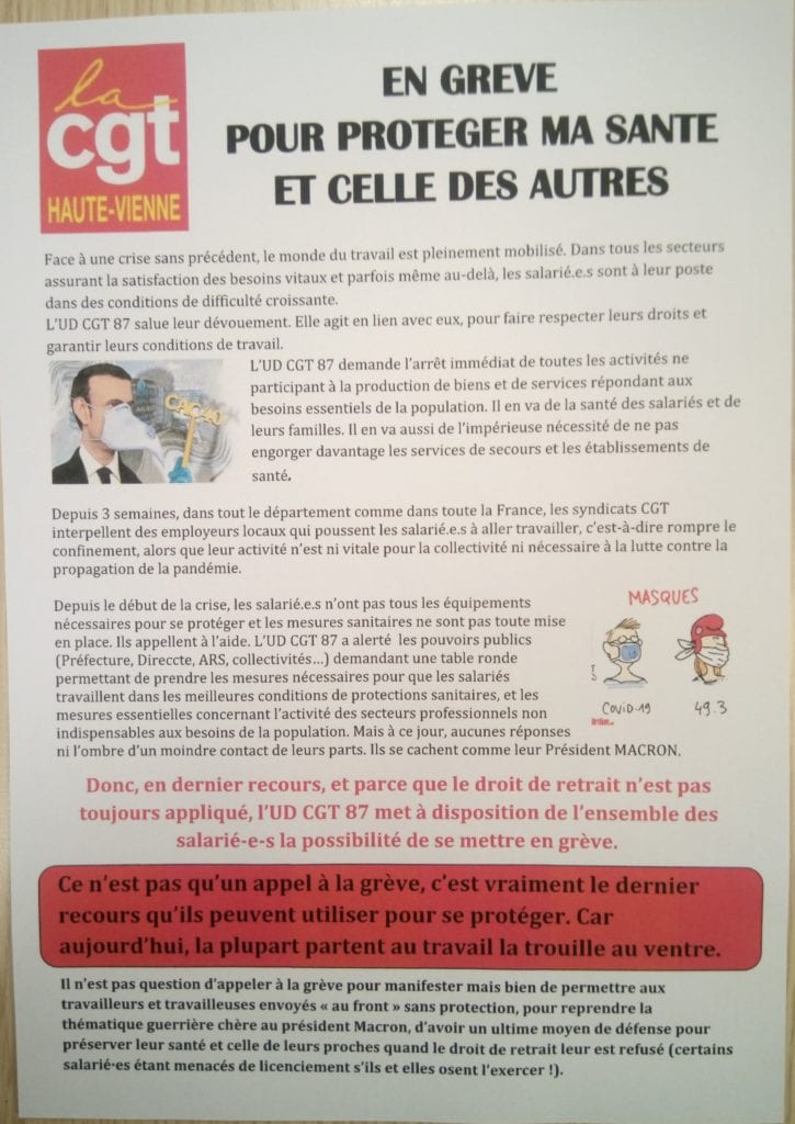 C’est pourquoi l’UD CGT 87 appelle tous les salariés qui ne peuvent faire valoir leurs droits en matière de sécurité et d’affaiblissement de leurs droits sociaux de se mettre en grève jusqu’à la fin de cette crise.