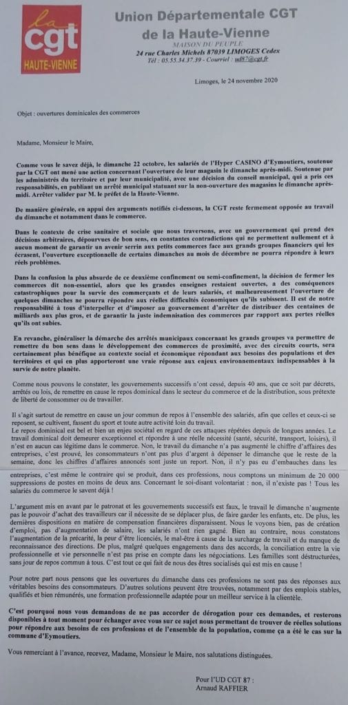Ouvertures dominicales des commerces : Courrier de l’UD aux mairies du 87