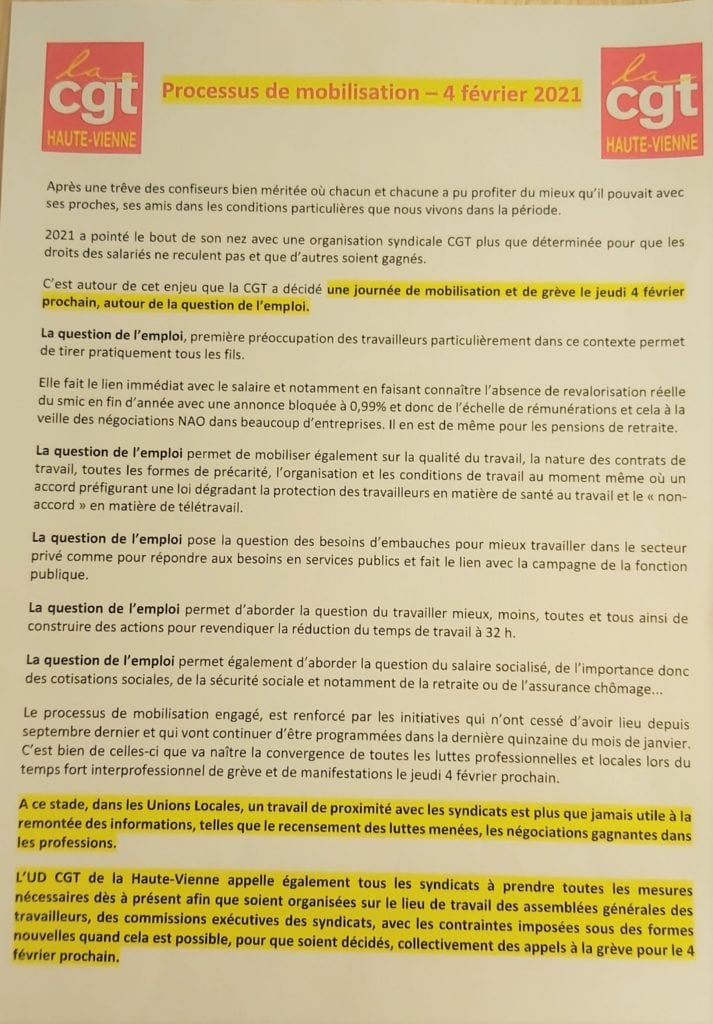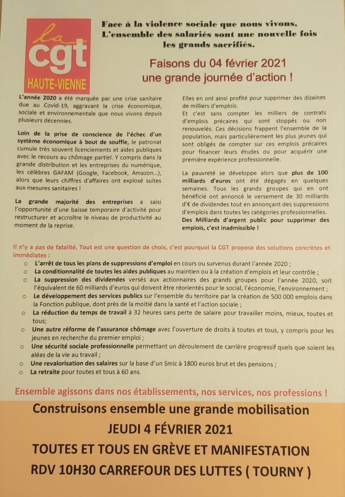 Grève et manifestation du 04 février – 10h30 carrefour des luttes (Tourny)