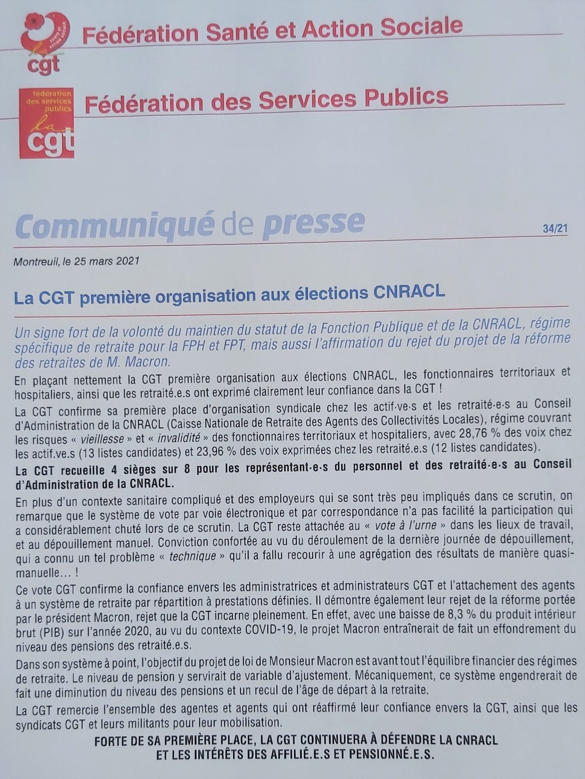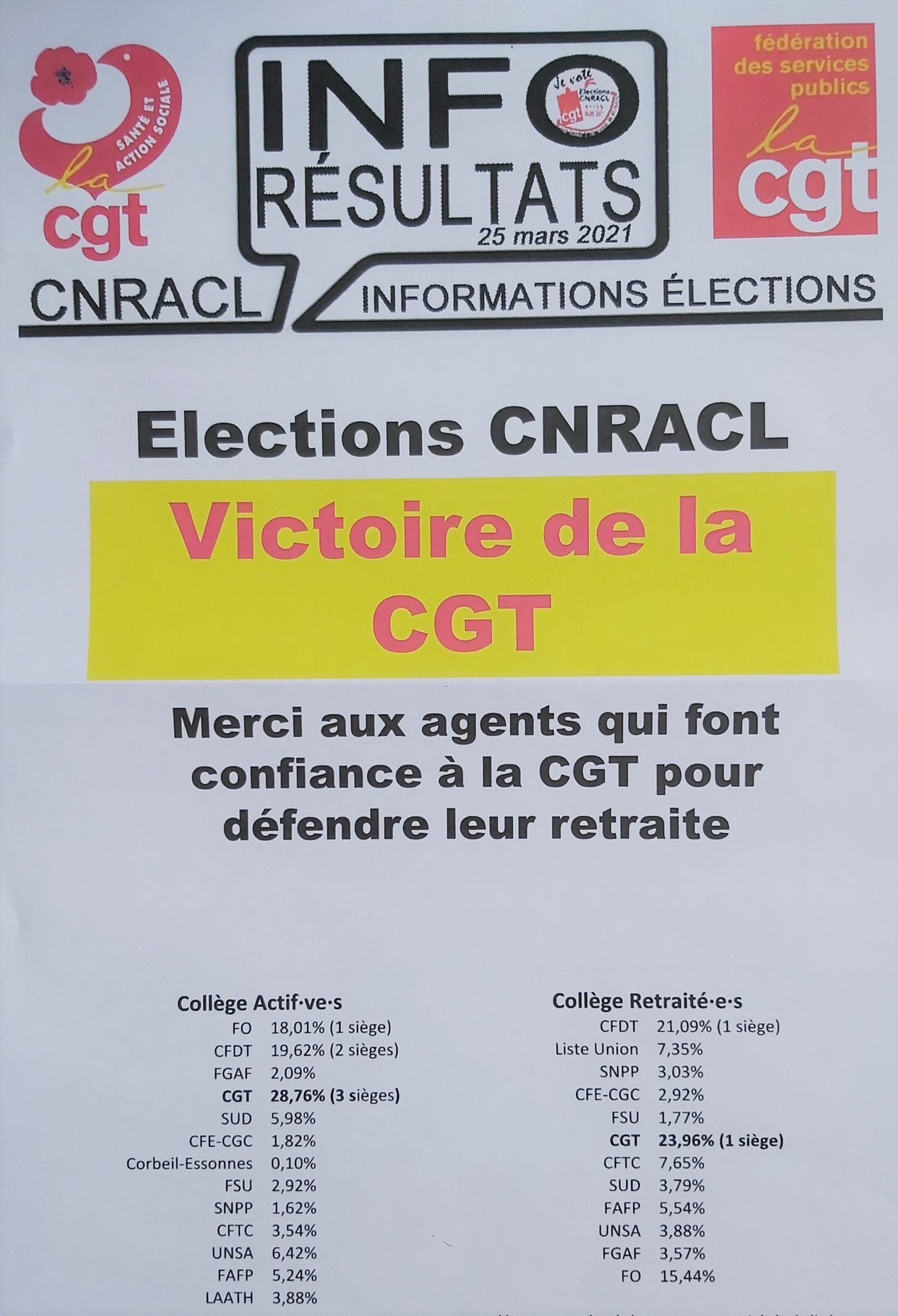Elections CNRACL : Victoire de la CGT !! Tweeter Partager Partager Imprimer cet article Télécharger cet article 25 mars 2021