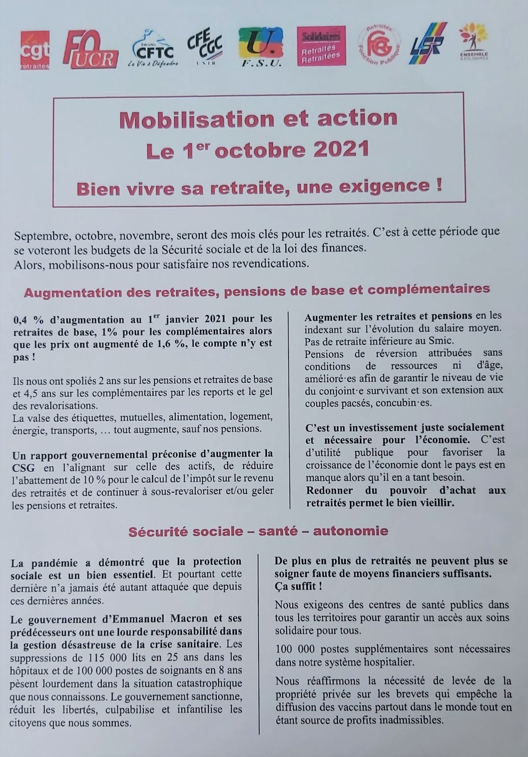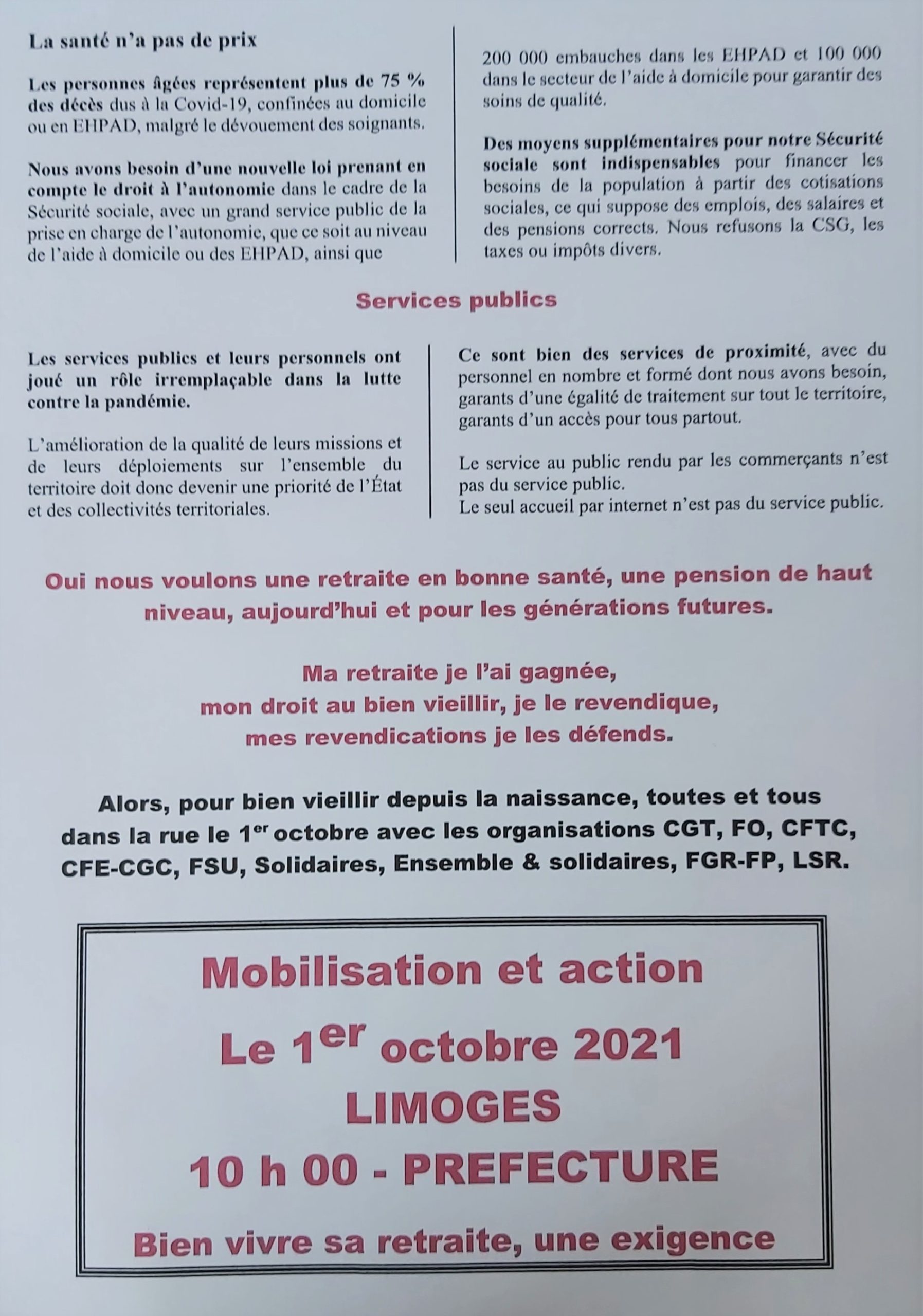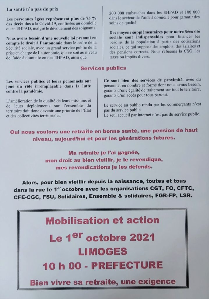 Mobilisation et action des retraité(e)s : 1er octobre 10h00 préfecture de Limoges